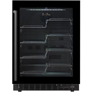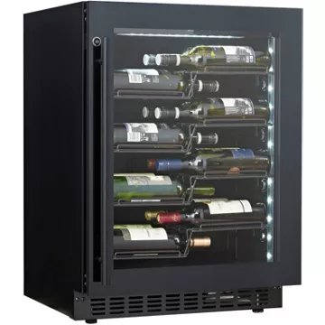 - Type de porte : vitrée, permet de visualiser facilement les bouteilles sans avoir à ouvrir la porte, ce qui réduit la circulation de l’air dans la cave et donc la variation de la température. Le traitement anti-uv protège le contenu.