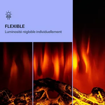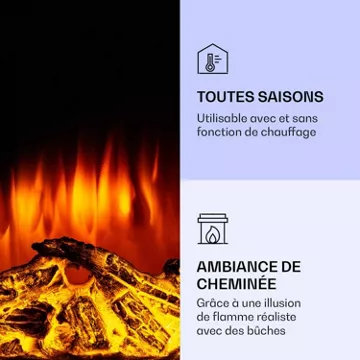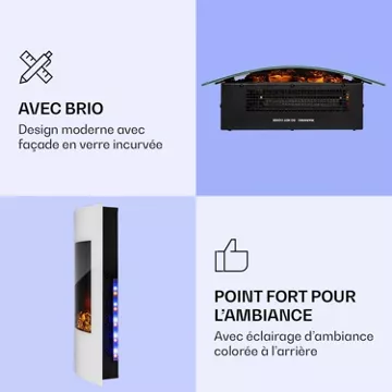 Des flammes LED réalistes et une chaleur agréable : la cheminée électrique Klarstein Lamington crée chez vous une ambiance merveilleusement chaleureuse. Ses deux niveaux de chauffage garantissent des températures agréables et le feu LED crépitant se propage vivement au-dessus des bûches. Le point fort particulier du foyer mural Lamington est son éclairage d’ambiance en couleur à l’arrière. De plus, vous pouvez régler à votre convenance la luminosité des flammes. Avec sa minuterie intégrée et sa télécommande pratique, la Lamington répond à toutes les attentes. Sa façade incurvée en verre complète habilement son design moderne.