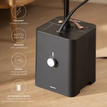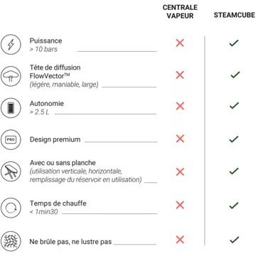 Avec un réservoir de 2,5L offrant une autonomie de 90 minutes et un temps de chauffe rapide de 120 secondes, le STEAMONE SteamCube est conçu pour une utilisation pratique et continue. Son système anti-goutte et la soleplate chauffante renforcent son efficacité, tandis que la capacité à éliminer virus et bactéries ajoute une dimension hygiénique précieuse. La durabilité n’est pas en reste : ce produit est réparable et ses pièces sont disponibles pendant 10 ans, témoignant de l’engagement de STEAMONE envers la longévité et la réparabilité de ses appareils. Enfin, la finition en inox et aluminium, ainsi que la poignée amovible, soulignent la qualité et la praticité de ce défroisseur vapeur, conçu pour répondre aux exigences des utilisateurs les plus attentifs.