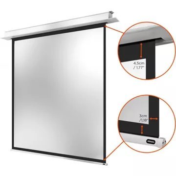 L’écran encastrable motorisé celexon PRO Plus dispose d’une toile de projection blanche et mate avec un dos opaque noir. Sa texture spécifique est idéale pour afficher des contenus en haute-résolution et ses bords noirs définissent les contours de l’image projetée en augmentant ainsi le contraste général.