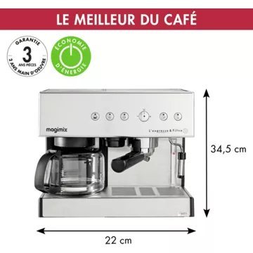 • Type de machine café : cafetière filtre combinée, permet la réalisation d’expressos et de café filtre selon vos envies