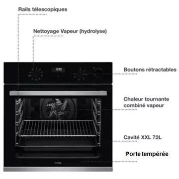 La chaleur pulsée vous permet même de cuire des plats totalement différents, sur plusieurs niveaux, sans mélange d’odeur, ni de saveur. Avec la garantie d’une cuisson parfaitement homogène. Le plat et le dessert cuisent ensemble pour un gain de temps assuré !