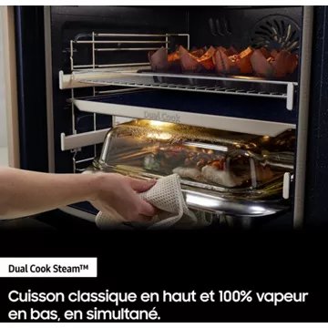 À vous les repas de chef étoilé dans le confort de votre domicile ! Avec le four NV7B7997AAK Série 7 AI Bespoke, Samsung met à votre disposition un appareil ultra-performant et intuitif. Sa technologie Dual Cook Flex dote votre four de deux cavités indépendantes qui vous permettent de cuisiner deux plats en même temps, à des températures différentes. Grâce à des modes de cuisson ultra performants comme la fonction vapeur et la cuisson sous vide, vous bénéficiez de possibilités infinies en cuisine. Bon appétit !