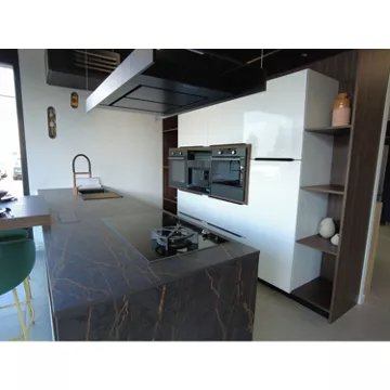 - Type de hotte : ilot, ajoute une touche esthétique moderne à la cuisine, libérant l’espace mural et offrant une extraction efficace des fumées et odeurs de cuisson. Elle crée un point élégant et fonctionnel au-dessus de l’îlot de cuisson, améliorant ainsi l’expérience culinaire et le design global de la cuisine.