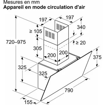Conçue pour un montage mural, la hotte BOSCH DWK85DK60 s’adapte à toutes les configurations de cuisine, avec un écart minimal requis de 450 mm au-dessus des tables de cuisson électriques et de 650 mm pour les gazinières. Son moteur silencieux limite le niveau sonore à seulement 60 dB(A), assurant ainsi une ambiance agréable dans la cuisine. La hotte inclut un clapet anti-retour et peut être installée en mode évacuation ou recyclage, avec l’ajout d’un kit de recyclage disponible en option. Les dimensions compactes (HxLxP) de 690-900 x 790 x 325 mm en mode évacuation et de 720-975 x 790 x 325 mm en mode recyclage, ainsi que le câble de raccordement de 1,5 m, offrent une flexibilité d’installation. Avec une classe d’efficacité énergétique A, cette hotte est non seulement puissante mais aussi économe en énergie.