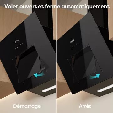 • Arrêt temporisé : oui, permet de programmer une durée de fonctionnement après la cuisson. Une fois cette durée écoulée, la hotte s’éteint automatiquement, offrant ainsi un moyen pratique d’économiser de l’énergie et de prolonger la purification de l’air après la cuisson.