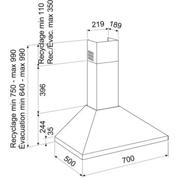 - Largeur : 70 cm, pour une zone de cuisson allant jusqu’à 70 cm de largueur.