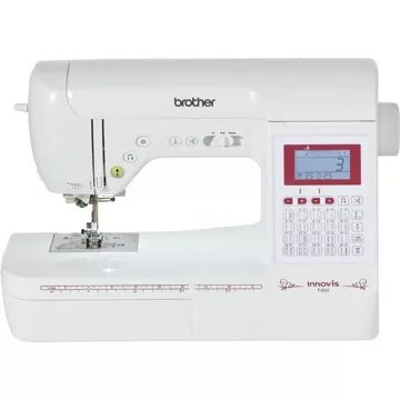 Machine à coudre Brother Innovis F400 – Garantie 5 ans La machine à coudre Brother F400 est la première machine disposant du système d’entrainement SFDS et d’un enfile aiguille dernière génération. Dotée de 40 points de couture elle conviendra aux couturières régulières. L’innovation technique au service de résultats professionnels. Avec un bel espace de travail et un système d’entraînement performant (SFDS), cette machine à coudre Brother permettra aux couturières assidues de créer facilement des ouvrages avec n’importe quel tissus. Simple d’utilisation, la machine à coudre Brother F400 donnera pleine satisfaction aux couturières qui recherchent une machine moderne et robuste, sans trop de points de couture. Notice en français. Caractéristiques : Écran LCS Monochrome 6.9cm (+ d’informations à l’écran) 40 points intégrés 6 styles de boutonnières automatiques Mise en place rapide de la canette Éclairage LED Coupe-fil automatique Système perfectionné d’enfilage de l’aiguille SFDS : Square Feed Drive System Abaissement des griffes d’entraînement Touche point d’arrêt Contrôle de la largeur du point grâce au variateur de vitesse Touche de position initiale de l’aiguille Touche d’arrêt de l’aiguille (en haut ou en bas) Point inverse / de renfort automatique Capot rigide Poids : 11.240 Kg Entrainement SFDS Coupe fils automatique Insertion plus efficace des tissus large espace de travail Accessoires et pieds inclus Jeu d’aiguilles Aiguille double Canettes (4) Découvite Brosse Perce Œillet Tournevis (2) Porte bobine Couvercle de bobine (3) Pied Zig Zag ‘J’ Pied pour monogrammes ‘N’ Pied pour faufilage ‘G’ Pied pour fermeture à glissière ‘I’ Pied point invisible ‘R’ Pied pose bouton ‘M’ Pied boutonnières ‘A’ Retrouvez tous les accessoires compatibles avec cette machine en cliquant ici Également inclus : Capot rigide, pédale, Manuel d’instruction, Guide de référence rapide Assistance téléphonique, pièces, main-d’œuvre, frais de transport – aller/retour – uniquement pour la France métropolitaine (dont la Corse), la Belgique et le Luxembourg