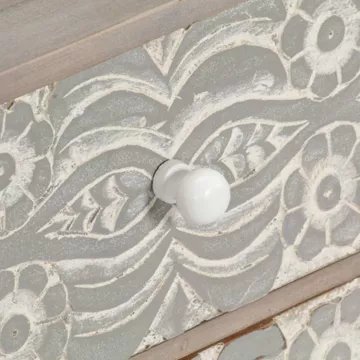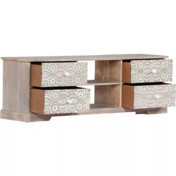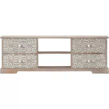 Ce meuble TV arborant de magnifiques motifs sculptés apportera une touche intemporelle à votre intérieur. Ce meuble HiFi est fait de bois d’acacia massif avec finition blanche pour lui donner un aspect magnifique et une couleur vive. Le savoir-faire et les grains de bois gracieux rendent chaque meuble extraordinaire et légèrement différent l’un de l’autre. De plus, le savoir-faire parfait garantit que chaque étape du processus est réalisée avec le plus grand soin, que ce soit le polissage, la peinture ou le laquage. Les motifs élégants sculptés à la main sur la face avant des tiroirs ajoutent à la beauté du meuble. Ce buffet dispose de 4 tiroirs et de 2 compartiments, offrant un grand espace pour ranger vos périphériques multimédia, vos livres ainsi que divers objets. Remarque importante : les grains varient d’une pièce à l’autre, rendant chaque pièce unique ; la livraison est aléatoire. Couleur : Blanc et gris Matériau : bois d’acacia massif Dimensions : 120 x 30 x 40 cm (l x P x H) Surface polie, peinte et laquée Avec de magnifiques motifs sculptés à la main Avec 2 compartiments et 4 tiroirs