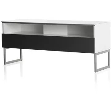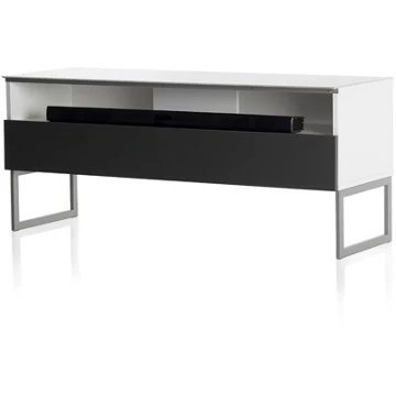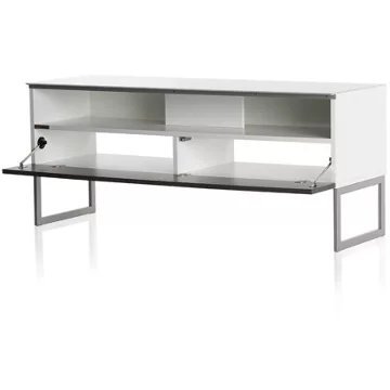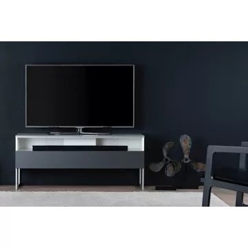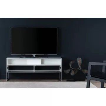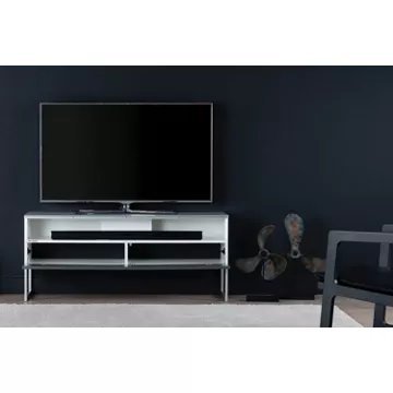 Meuble TV avec demi-porte abattanteALICANTE 120 offre des solutions de gestion des câbles et d’aération pour vos équipements audio-vidéo.Caisson en bois mélaminé de couleur blanche.2 configurations intérieures disponibles (le choix se fait lors du montage du meuble) : version standard avec 4 compartiments et version spéciale barre de son avec 3 compartimentsDemi-porte abattante en bois de couleur grise permettant de laisser la partie supérieure du caisson ouverte pour pouvoir utiliser sa barre de son et piloter ses appareils sans ouvrir le meuble. Ouverture par pression avec aimant poussoir.Le plateau en verre trempé de couleur blanche offre une finition brillante tout en apportant une protection supplémentaire. Pieds design de couleur silver.Meubles livrés non montés avec notice et visserie.Garantie 2 ans