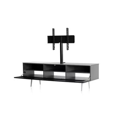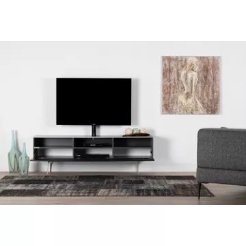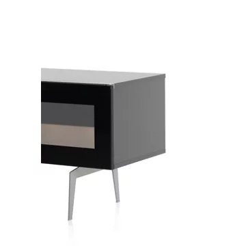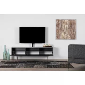 Meuble TV avec porte en verre opaque infrarougeCADAQUES 160 offre des solutions de gestion des câbles et d’aération pour vos équipements audio-vidéo.Caisson en bois mélaminé de couleur grise.2 configurations intérieures disponibles (le choix se fait lors du montage du meuble) : version standard avec 6 compartiments et version spéciale barre de son avec 4 à 5 compartiments.Porte abattante en verre opaque infrarouge de couleur noire pour télécommander vos périphériques sans ouvrir la porte. Ouverture par pression avec aimant poussoir.Pieds vintage de couleur silver.Fixation TV rotative à 24° avec colonne cache câble noire en aluminium. Poids max TV 35 kg (la fixation s’assemble sur la partie supérieur du meuble). Vesa 200 300 400 600.Meubles livrés non montés avec notice et visserie.Garantie 2 ans