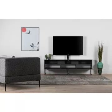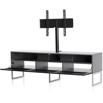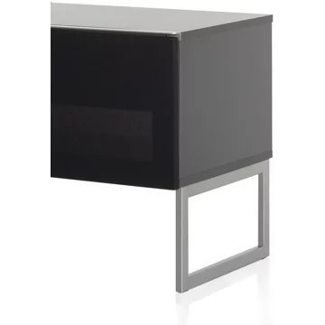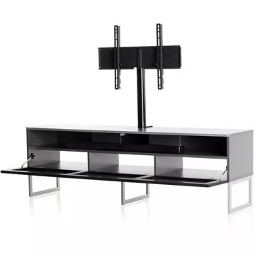 Meuble TV avec porte en textile acoustique & infrarougeGERONE 160 offre des solutions de gestion des câbles et d’aération pour vos équipements audio-vidéo.Caisson en bois mélaminé de couleur grise.2 configurations intérieures disponibles (le choix se fait lors du montage du meuble) : version standard avec 6 compartiments et version spéciale barre de son avec 4 à 5 compartiments.Porte abattante en textile acoustique infrarouge de couleur noire pour télécommander vos périphériques sans ouvrir la porte. Ouverture par pression avec aimant poussoir.Pieds design de couleur silver.Fixation TV rotative à 24° avec colonne cache câble noire en aluminium. Poids max TV 35 kg (la fixation s’assemble sur la partie supérieur du meuble). Vesa 200 300 400 600Meubles livrés non montés avec notice et visserie.Garantie 2 ans.