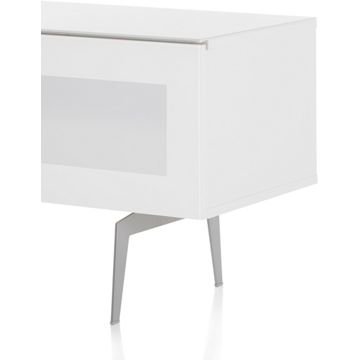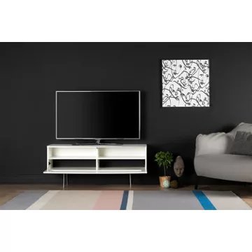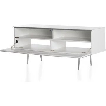 Meuble TV avec porte en verre opaque infrarougeLORCA 120 offre des solutions de gestion des câbles et d’aération pour vos équipements audio-vidéoCaisson en bois mélaminé de couleur blanche.2 configurations intérieures disponibles (le choix se fait lors du montage du meuble) : version standard avec 4 compartiments et version spéciale barre de son avec 3 compartimentsPorte abattante en verre opaque infrarouge de couleur blanche pour télécommander vos périphériques sans ouvrir la porte. Ouverture par pression avec aimant poussoir.Le plateau en verre trempé de couleur blanche offre une finition brillante tout en apportant une protection supplémentaire. Pieds vintage de couleur silver.Meubles livrés non montés avec notice et visserie.Garantie 2 ans
