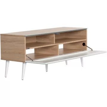 Meuble TV avec porte en verre opaque infrarouge.MOTALA 120 offre des solutions de gestion des câbles et d’aération pour vos équipements audio-vidéo.Caisson en bois mélaminé de couleur bois clair.2 configurations intérieures disponibles (le choix se fait lors du montage du meuble) : version standard avec 4 compartiments et version spéciale barre de son avec 3 compartiments.Porte abattante en verre opaque infrarouge de couleur blanche pour télécommander vos périphériques sans ouvrir la porte. Ouverture par pression avec aimant poussoir.Pieds scandinaves de couleur blanche.Meubles livrés non montés avec notice et visserie.Garantie 2 ans.