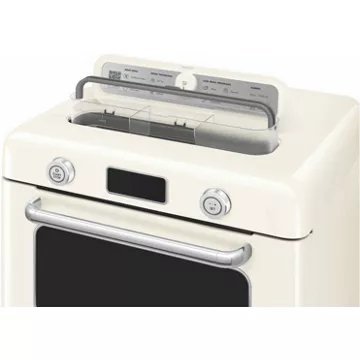 Le Mini four SMEG COF01CREU, avec son esthétique inspirée des années 50, apporte une touche de nostalgie et d’élégance à toute cuisine. Ce modèle crème, rehaussé de touches de gris et de finitions brillantes, se distingue par son design emblématique SMEG. Le levier et les manettes en plastique, les touches en aluminium chromé brillant et la porte en verre fumé avec cadre en plastique poli confèrent à ce mini four un aspect aussi robuste que raffiné. La qualité est également visible à l’intérieur avec une cavité en inox, garantissant une durabilité et une facilité de nettoyage exceptionnelles.