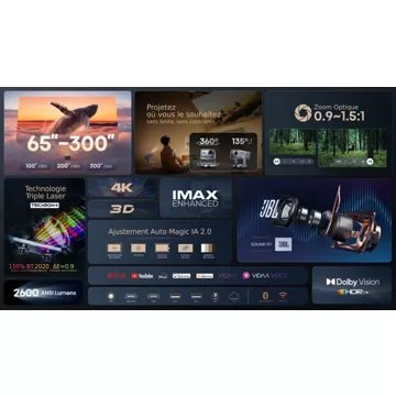 Le HISENSE C2 PRO est bien plus qu’un simple vidéoprojecteur ; c’est un centre de divertissement intelligent. Avec Smart TV intégrée (VIDAA U7), WiFi6e, Bluetooth et Airplay, il offre un accès facile à du contenu en ligne, des applications et permet le partage d’écran depuis un PC, une tablette ou un mobile. La barre de son intégrée JBL, d’une puissance de 2x10W, assure un son de qualité cinéma grâce à des effets surround et des paramètres avancés d’égalisation. De plus, la compatibilité avec les assistants vocaux Alexa et VIDAA Voice rend son utilisation encore plus intuitive. Avec ses multiples connectiques, dont 2 HDMI 2.1 et des ports USB3.0, le C2 PRO est prêt à accueillir tous vos appareils pour une expérience multimédia complète et sans compromis.