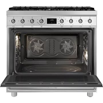 Le piano de cuisson gaz SMEG C9GMX2 se distingue par son esthétique Classica, avec des manettes en inox, une porte dotée de deux bandeaux horizontaux et un design carré séduisant. La couleur inox satiné et les poignées Smeg Classica en inox brossé confèrent à ce modèle une allure sophistiquée qui s’intègre parfaitement dans les cuisines modernes. Avec ses dimensions généreuses de 90×60 cm, ce centre de cuisson offre un espace de travail confortable. L’afficheur tactile, les grilles en fonte et le verre noir Eclipse de la porte témoignent de la qualité et de la fonctionnalité de cet appareil. La classe d’efficacité énergétique A assure une consommation optimisée, tandis que le système de nettoyage Vapor Clean facilite l’entretien du four principal à chaleur tournante.