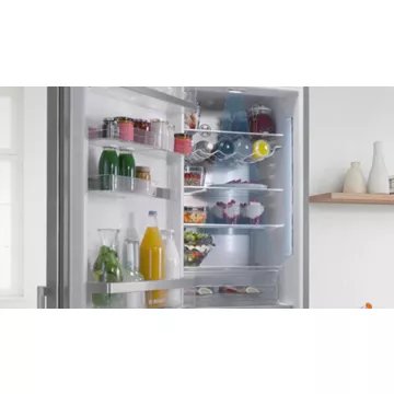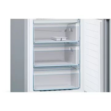 Il est toujours plus agréable d’avoir un réfrigérateur bien rangé. Le réfrigérateur combiné BOSCH KGN36VLED comprend 4 clayettes en verre (dont 2 réglables en hauteur), 3 clayettes coulissantes, 1 rack à bouteilles, 3 balconnets, 3 casiers à oeufs et 1 bac à glaçons. Vous pourrez facilement organiser le stockage de vos provisions et avoir une meilleure visibilité sur vos denrées.