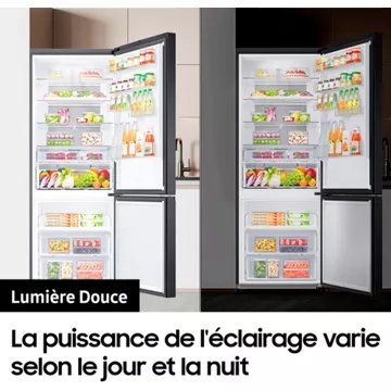 Le réfrigérateur Samsung COMBINÉ RB50DG602EB1 se connecte à l’application SmartThings. Si vous êtes sujet aux fringales nocturnes, mais que vous ne voulez pas être trop ébloui, vous pouvez régler l’intensité de l’éclairage intérieur du réfrigérateur. Avec l’option Lumière douce sur l’application, vous pouvez choisir entre les modes Lumière tamisée ou Nuit pour éviter de trop vous réveiller, quand vous ouvrirez le réfrigérateur.