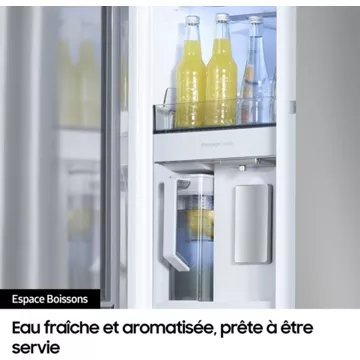 - Type d’alimentation d’eau : alimentation d’eau classique : L’utilisation du distributeur nécessite le branchement du réfrigérateur à une arrivée d’eau froide (le tuyau de raccordement est fourni)