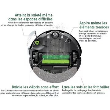 Le nettoyage en quatre étapes associe notre brosse latérale, nos 2 extracteurs en caoutchouc multisurfaces, notre aspiration surpuissante et notre laveur unique en son genre. Sur les sols durs, il aspire et lave en même temps. Pour les moquettes et tapis, il soulève sa lingette et l’éloigne en toute sécurité, afin de poursuivre son travail avec une aspiration puissante. Le robot est fourni avec notre système d’autovidage Clean Base®, lui permettant de se vider automatiquement pendant deux mois. Ses sacs anti-allergènes ne se contentent pas de capturer et retenir 99 % du pollen et des moisissures, puisqu’au moment de les changer, ceux-ci se ferment tout seuls, empêchant la dispersion de poussière pour un air sain. Il cible les zones particulièrement sales. En effet, certaines zones de votre maison ont tendance à se salir plus que d’autres, comme les couloirs ou entrées très fréquentés, et pas seulement. C’est pourquoi nous avons développé les capteurs de saleté Dirt Detect®, capables de reconnaître les zones nécessitant une attention particulière. C’est alors que le Roomba Combo® j7+ entre en action, en apportant le niveau de nettoyage adéquat pour cette zone.