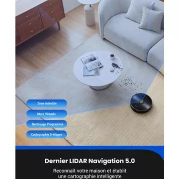• Technologie laser : permet à l’aspirateur d’analyser en permanence et avec précision la pièce (éclairée ou non) et d’évaluer les distances entre chaque objet afin de les éviter. Cette analyse continue permet à l’aspirateur de cartographier l’intégralité d’un appartement ou d’une maison