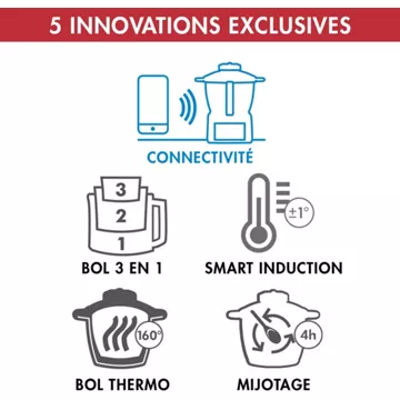 Avec son bol thermo inox de 3,5 L et ses 3 bols multifonction, il cuit, coupe, mélange, hache, râpe, mijote, pétrit et pile à la perfection.