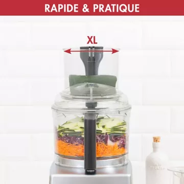 • Accessoires : 3 cuves (cuve standard, mini-cuve, midi cuve), boîte de rangement des accessoires, couteau hachoir, couvercle anti-projections, disque(s) éminceur, disque(s) râpeur, presse-agrumes, rapeur/Trancheur, spatule