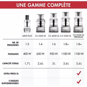 URL SCENE7Le robot MAGIMIX C.S. 5200 XL Premium est un appareil complet qui permet de réaliser toutes les préparations pénibles à faire à la main. Equipé de plusieurs disques, il vous permet de râper, émincer, pétrir, battre et hacher à la fois des légumes, des viandes ou du fromage.