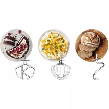 • Accessoires : batteur, couvercle anti-projections, crochet pétrisseur, fouet à fils, spatule