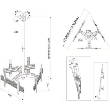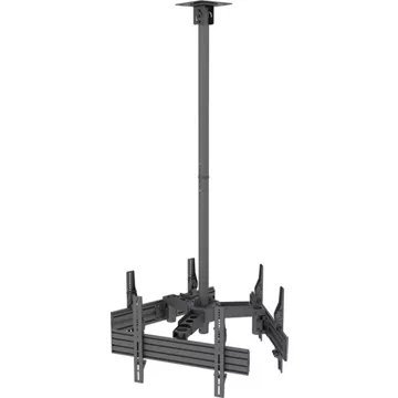 Le support de plafond KIMEX 014-6003 est conçu pour installer trois écrans ou moniteurs de 32 à 65 pouces répondant au standard VESA (100x100mm min, 600x400mm max) jusqu’à 30 kg. Ce support professionnel multi-écrans intègre un mât réglable en hauteur (860 mm min – 3255 mm max) qui peut être installé sur un plafond plat ou incliné, et des bras télescopiques sur lesquels sont montés en carré quatre écrans pour fournir une solution d’affichage plafond multi-écrans. Très fonctionnels, les bras horizontaux sont réglables en profondeur pour une installation facile et un réglage précis des écrans. Avec une rotation à 360° et une inclinaison ajustable vers le haut et vers le bas (+6°/ -15°), ce support vous apporte le meilleur angle de vision en fonction de votre besoin. Conçu dans une optique d’esthétisme pour être installé en magasin et dans tout lieu recevant du public, ce support intègre enfin un système efficace pour la gestion des câbles qui garantit un rendu parfait.