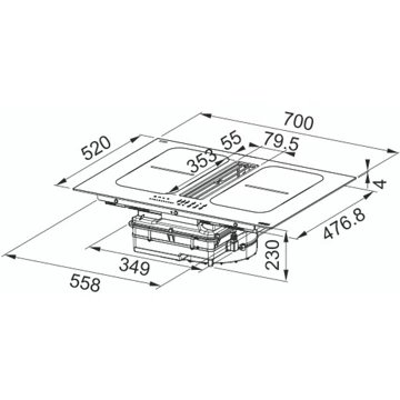- Installation du kit recyclage sans gaine : permet une installation optimisée de votre table évitant ainsi l’utilisation de gaines et de coudes. L’extraction de l’air se fait directement dans le vide sanitaire de votre meuble.