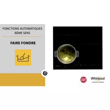 La fonction ChefControl vous permet d’obtenir 3 niveaux de températures différents. Pour cela, il vous suffit juste de glisser votre plat sur la zone FlexSide. La table à induction WHIRLPOOL WFS7560NEest équipée de la technologie 6e sens. Elle vous propose 4 fonctions préprogrammées accessibles sur les 4 foyers : bouillir, mijoter, maintien au chaud et fondre.