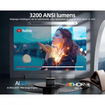 Projecteur 4K – Le projecteur Mars Pro est doté d’une résolution avancée 4K (3840 x 2160p), de 3200 lumens ANSI, de la technologie HDR 10 et de la technologie HLG. Il dispose également d’un moteur d’image professionnel AI qui utilise un capteur de lumière et des algorithmes AI auto-développés pour ajuster la luminosité de l’écran de manière précise. De plus, il prend en charge l’imagerie 3D, vous permettant de profiter de vos contenus préférés de jour comme de nuit