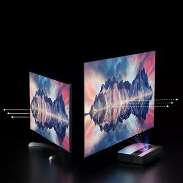 Équipé de la technologie Ultra Short Throw (UST) la plus avancée du marché, AURA propose des écrans impressionnants de différentes tailles sans compromis sur l’espace. Placez AURA 11,7 pouces de n’importe quel mur et profitez de 120 pouces d’images cristallines pour tout ce que vous regardez.